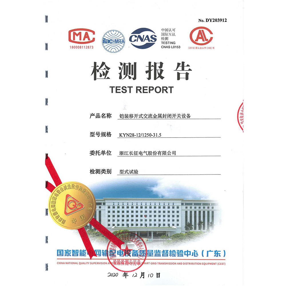 KYN28-12/1250-31.5鎧裝移開式交流金屬封閉開關設備 檢測報告