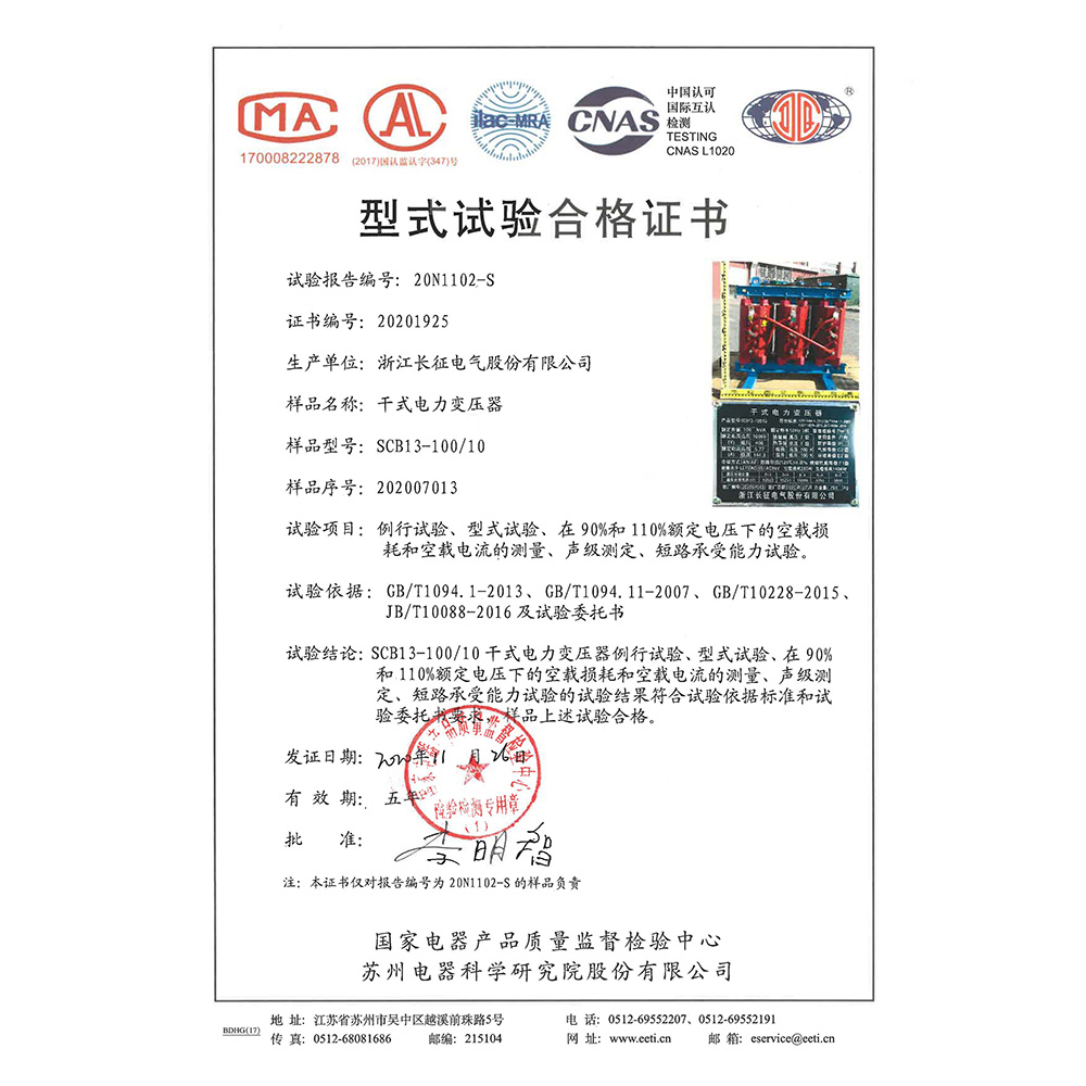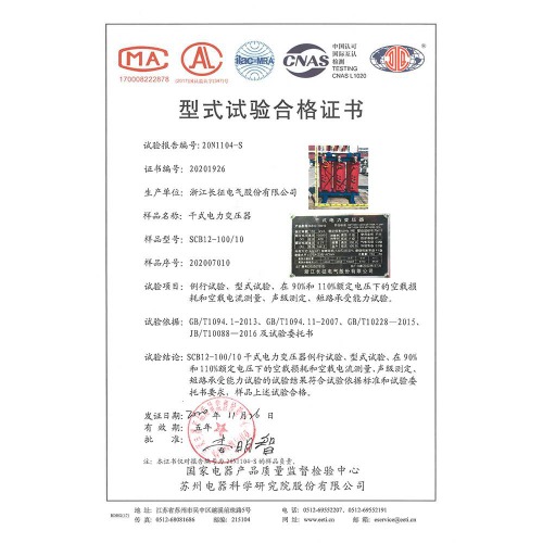 SCB13-100/10干式電力變壓器 型式試驗合格證書