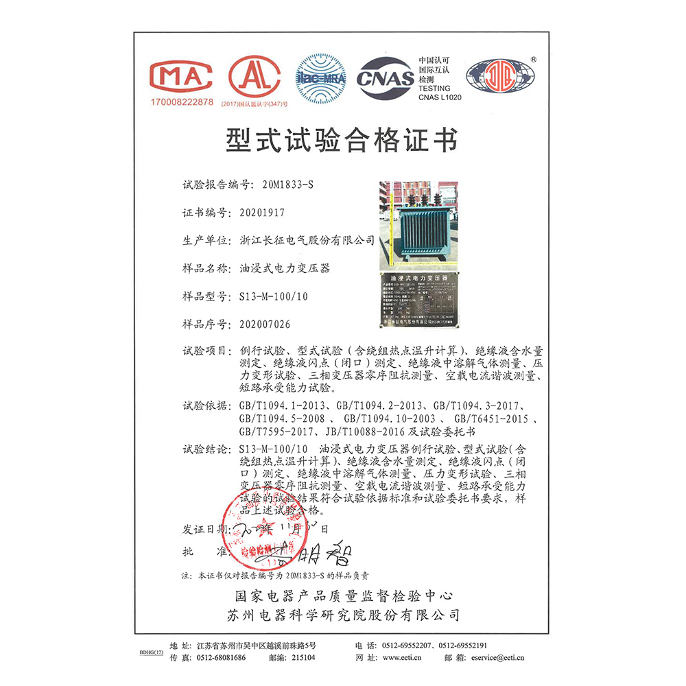 S13-M-100/10油浸式電力變壓器 型式試驗合格證書