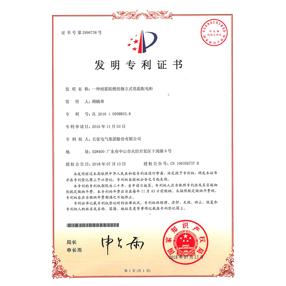 一種耐震阻燃的獨立式低溫配電柜 發(fā)明專利證書