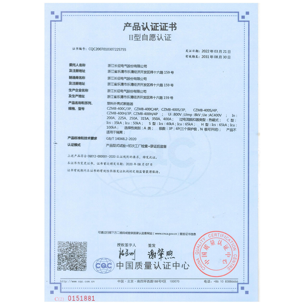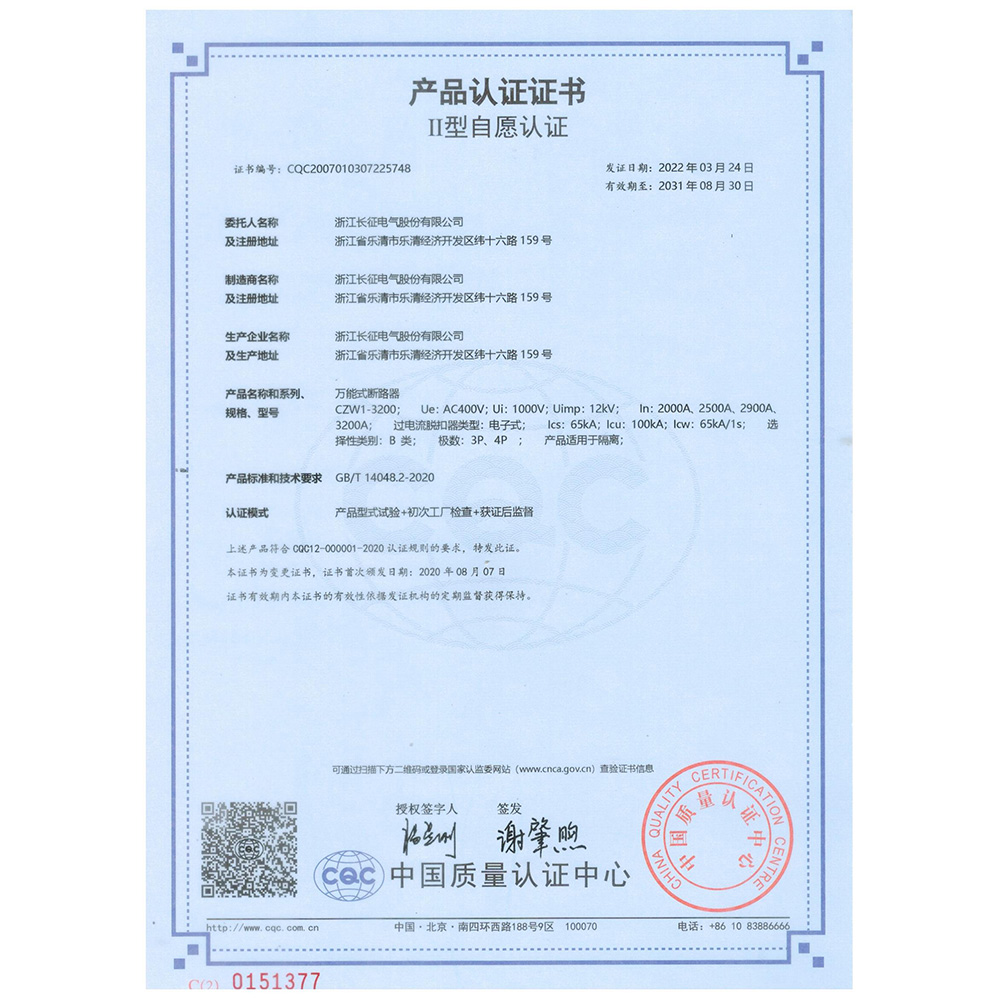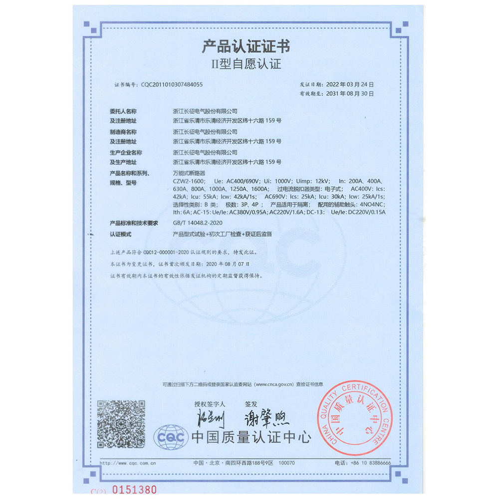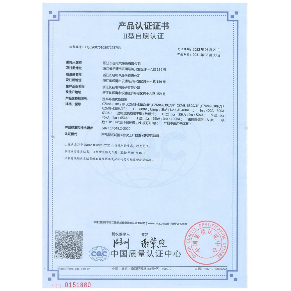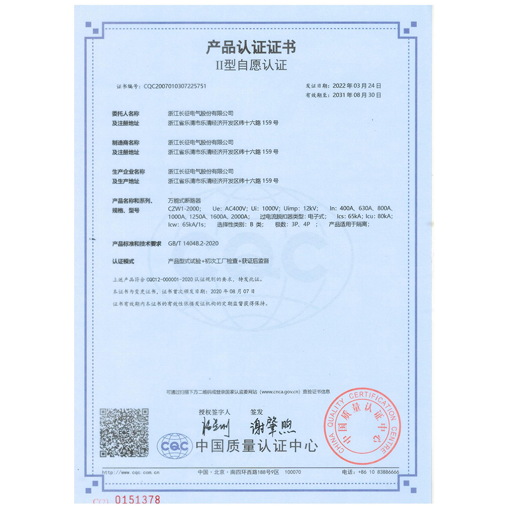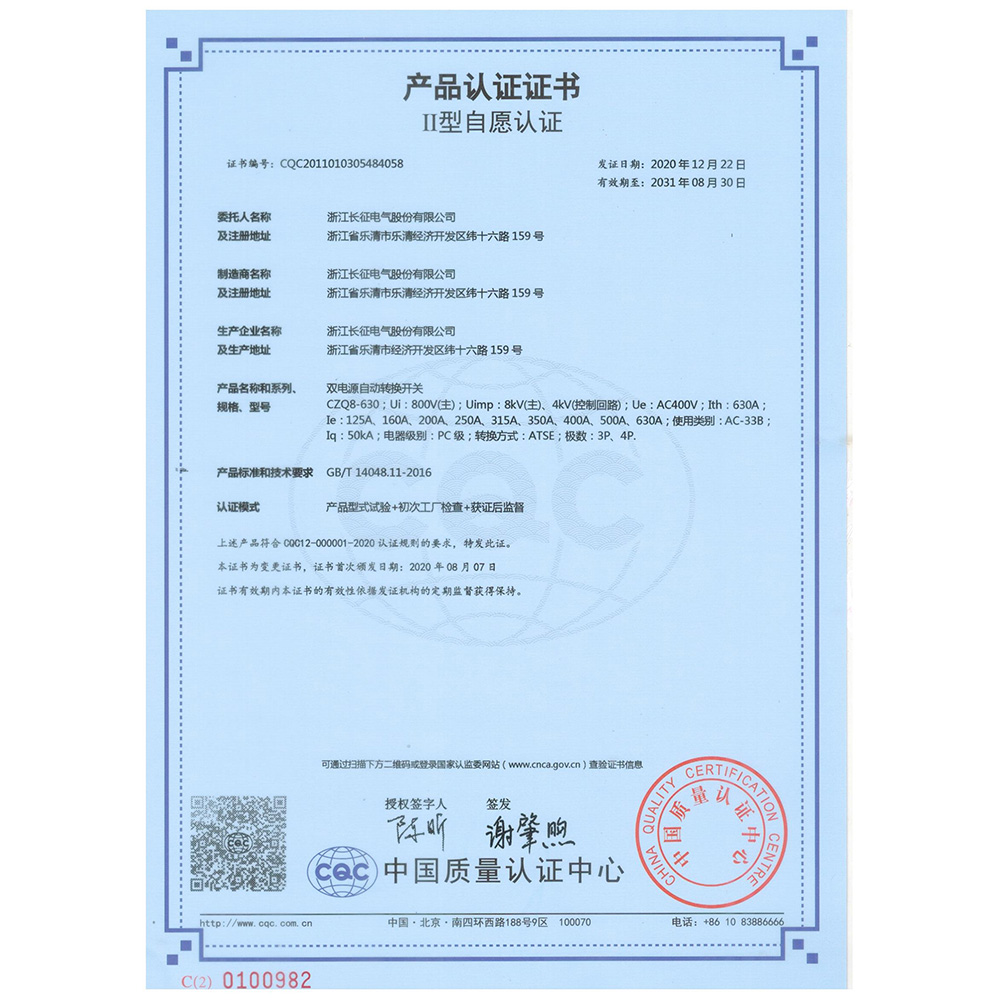 CZQ8-630雙電源自動轉換開關 產品認證證書