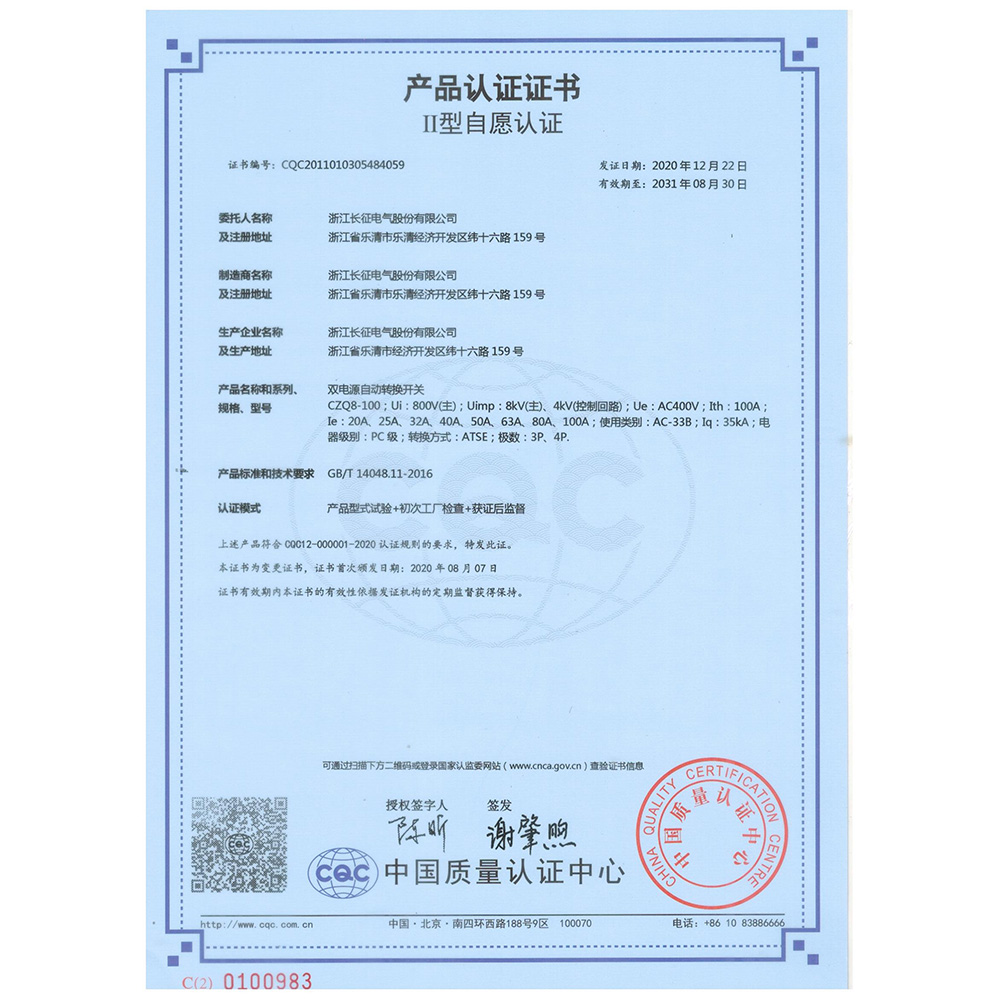 CZQ8-100雙電源自動轉換開關 產品認證證書