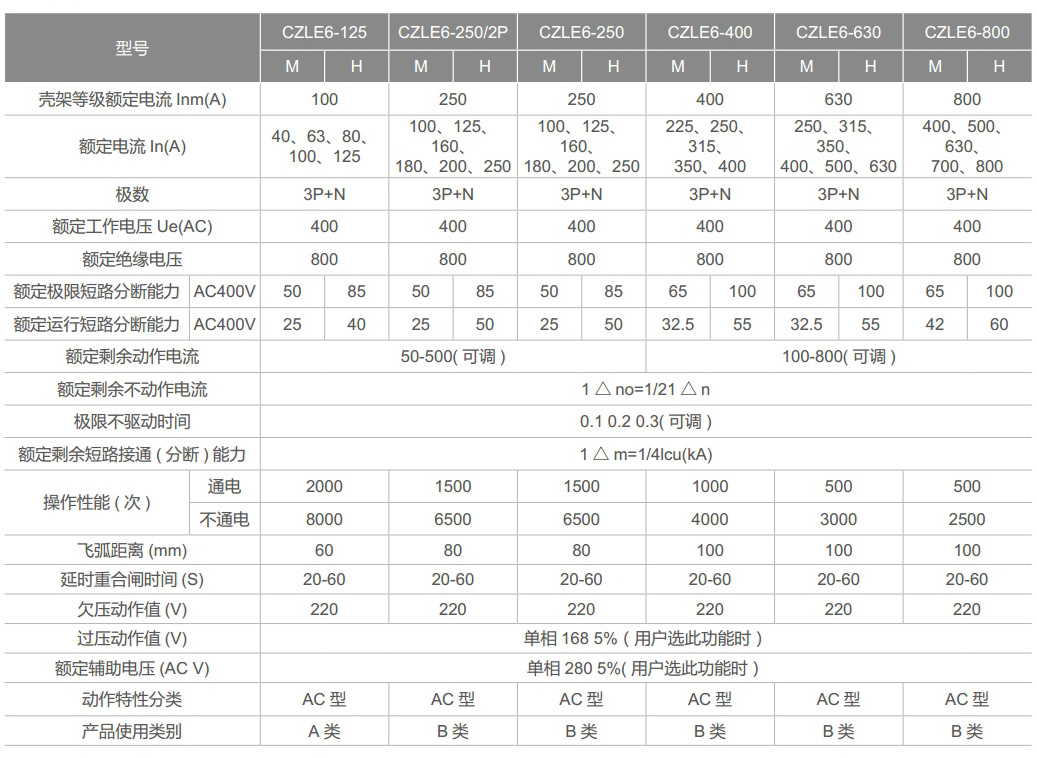 CZLE6系列剩余電流保護斷路器(以下簡稱斷路器)符合國家電網管理的各項智能化要求,是配合國家智能電網運行的選用產品,是集剩余電流繼電器塑殼式斷路器集各種功能附件于一體的多功能綜合斷路器。塑殼式斷路器為主開關,分斷能力高、分斷時間準確。一體式配電綜合保護斷路器具有體積小,安裝使用方便動作值固定分檔可調、操作簡易、能適應各地用戶各種環境,按需設定。通信型系列的產品采用CZ-485通信口,能與電腦建立通信功能,實現遠程參數的調整、信息查詢及下載故障參數等功能。產品型號說明