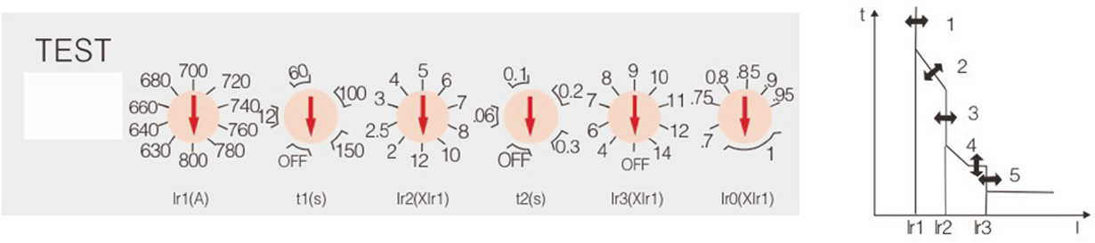 ?1、過載長延時動作電流 Ir1 調整根據斷路器不同的額定電流可從 4 檔到 10 檔進行調整;